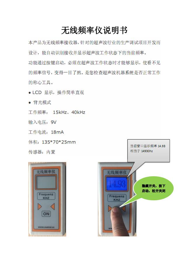 Sonikks 索尼科斯 超声波测频仪,超声波频率计无线频率仪说明书本产品为无线频率接收器,针对的超声波行业的生产调试项目开发而设计,能自动识别接收并显示超声波工作状态下的当前频率。功能通过按键启动,必须在超声波工作状态时才能够显示,使看不见的频率信号,变得一目了然。是您检查超声波机器系统是否正常工作的称心工具。● LCD 显示,操作简单直观● 背光模式工作频率: 15kHz、40kHz输入电压:9V工作电流:18mA体积:135*70*25mm传感器:内置